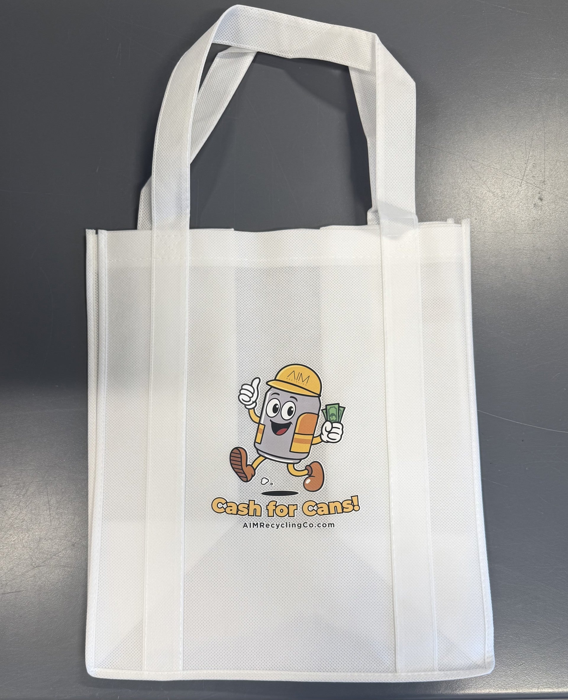 White tote bag with "Cash for Cans" on the front and the AIM Recycling logo in black on the back. The tote is durable and perfect for grocery shopping! It also sports the AIM Recycling website and a cute graphic of a running can in a hard hat and safety vest holding cash.
